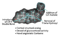 Structurally, anecortave acetate differs from cortisol by the removal of 11-beta hydroxyl, addition of a double bond at the C9-11 position, and addition of an acetate group at the C21 position, which results in a novel angiostatic cortisene that enhances angiostatic activity but does not exhibit typical glucocorticoid-receptor-mediated activity (Figure 1). These modifications eliminated most antiinflammatory activity typical of the initial cortisol molecule. Preclinical studies confirmed that the molecule lacks the typical immunosuppressant activity normally associated with steroidal structures. The drug does not inhibit IL-1beta secretion in U937 human lymphoma cells pretreated with lipopolysaccharide,6 nor does the novel cortisene exhibit antiinflammatory activities in the rat and rabbit models of endotoxin uveitis,7 or the carrageenan-induced rat foot paw edema model of inflammation. Despite an apparent lack of glucocorticoid activity, anecortave acetate possesses a broad range of antiangiogenic properties in numerous animal species and tissues independent of the initial angiogenic stimulus applied. Thus, the drug's therapeutic value for treating a variety of neovascular diseases appears quite promising.