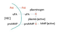 In vitro data indicate that anecortave acetate inhibits the proliferation of cultured human VECs. It also inhibits the expression of uPA and matrix metalloproteinase 3 (MMP3), 2 extracellular proteases necessary for the migration of endothelial cells into tissue stroma during blood vessel growth.9 Additionally, it stimulates the production of plasminogen activator inhibitor-1 (PAI-1), a specific inhibitor of uPA activity.10 In a rat model of retinopathy of prematurity, retinal levels of PAI-1 and mRNA increased 6- to 9-fold in 24 to 72 hours following intravitreal injection of the novel angiostatic cortisene.11 With the activities of uPA and MMP3 inhibited by anecortave acetate, proteolysis necessary for cellular migration cannot occur and angiogenesis is inhibited (Figure 2).