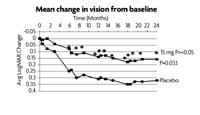 Long-term study results confirm the efficacy of anecortave acetate 15 mg for maintaining vision and suppressing lesion growth in patients with exudative AMD.14 At month 24, anecortave acetate 15 mg was numerically superior to other dosages tested and statistically superior to placebo in preserving visual acuity (P ¾0.05), stabilizing vision (P ¾0.05), preventing severe vision loss (P ¾0.05), and inhibiting the growth of classic choroidal neovascularization (P ¾0.05) in eyes with all lesion types. Beginning at the 6-month timepoint and continuing throughout the entire 24-month study, anecortave acetate 15 mg was consistently more effective in stabilizing vision compared to placebo (Figure 3).
