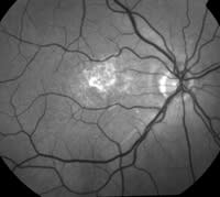 The digital color fundus image and the red-free image show fibrin and atrophic changes in this patient's macular area. |