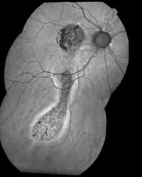 A composite autofluorescence image of the same patient clearly shows inferior tracts caused by the chronic leakage (drip) of the foveal CSC. The autofluorescence images were taken with a modified Topcon 50ex camera. PHOTOGRAPHS: MIKE RIFF, VITREOUS-RETINA-MACULA CONSULTANTS, NEW YORK, N.Y. |