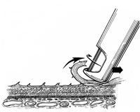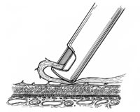 Figure 2. Indentation delamination of proliferative diabetic membranes. a. The cutter tip is positioned port-up near the membrane edge while the surface is gently indented by the instrument tip. b. Continuous aspiration produces traction on the membrane and the underlying fibrovascular pegs. c. Activation of the cutter while the membrane is under traction sheers the pegs from the underlying surface of the membrane while removing the membrane itself. Hemostasis is maintained by continual aspiration and cutting as the instrument is moved side to side, retreating from the membrane edge. |