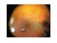 Figure 1. Injection of ICG in low concentration and directed to the macular prevents staining of the retina elsewhere, and minimizes the amount of dye left intravitreous. |