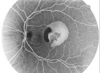 A white female patient, 68 years of age, presented with a 3-week history of sudden onset of decrease in vision in her left eye with progressive deterioration. On presentation her vision was 20/30 OD and 20/400 OS. The right eye had dry age-related macular degeneration (AMD). The left eye had thick subretinal blood in the center of the macula with diffuse retinal edema and a visible subfoveal vascular membrane (Figure 1). Fluorescein angiography showed significant blockage due to subretinal blood with a small area of poorly-defined late leakage under the fovea (Figure 2). Optical coherence tomography (OCT) showed significant diffuse subretinal fluid and retinal edema (Figure 3). A diagnosis of an occult subretinal neovascular membrane in her left eye due to exudative AMD was made.