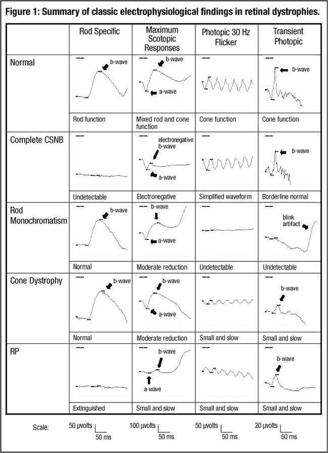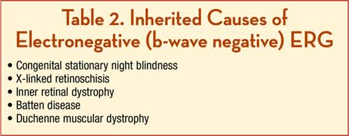 While full-field ERG evaluates mass cone and rod system function, pattern ERG (checkerboard stimulus) is useful to distinguish decreased vision secondary to optic nerve vs macular disease.8 An electrical response in a 30-Hz flicker ERG is an important prognostic tool because its presence confirms residual cone function.9,10
