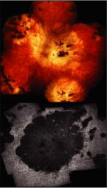 Figure 7. Group 3 Stargardt disease in a woman 57 years of age with bilaterally symmetric disease: Color fundus photo left eye with large areas of atrophic retina and pigment clumping (top), and autofluorescence right eye with large are of missing RPE and generalized hyperfluorescent flecks peripherally (bottom). Both her scotopic and photopic ERG responses are diminished.