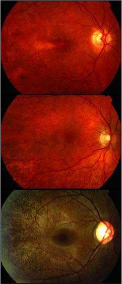 Figure 4. Choroidermia carrier with RPE mottling (top), ocular albinism carrier with radially oriented mosaic RPE hypopigmentation (middle), X-linked recessive RP carrier with a tapeto-like retinal sheen (bottom). X-linked heterozygous carriers are important to diagnose correctly, but fundus distinctions may be subtle.
