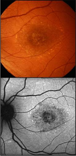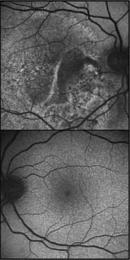 Figure 10. Sorsby pseudoinflammatory dystrophy in a man 53 years of age with asymmetric disease who has (top) an RPE tear in the OD (count finger vision) secondary to CNV and (bottom) fine drusen-like deposits in the left eye (20/20 visual acuity) on autofluorescence.