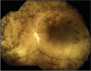 Figure 2. Leber congential amaurosis at its end stage in a woman 37 years of age with RPE migration, near total loss of retinal pigment epithelium cells, severe retinal atrophy, and peripapillary ghost vessels in her left eye. She retains light-perception vision and has an extinguished full-field ERG response.