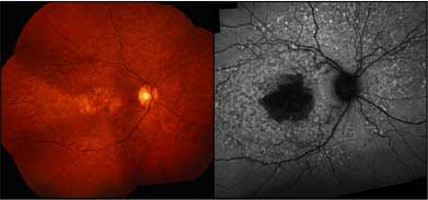 Figure 6. Group 1 Stargardt disease in a man 36 years of age: Color fundus photograph right eye with macular atrophy and generalized flecks (left) and corresponding autofluorescent imaging (right) shows RPE atrophy (hypofluorescent) centrally and flecks (hyperfluorescent). This patient has extinguished P50 responses and normal full field ERG responses.