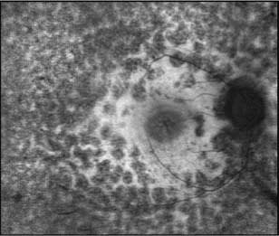 Figure 3. Usher syndrome in a woman 34 years of age. Autofluorescence of the right eye shows RPE atrophy underneath degenerated rods. Note the cystoid macular edema, a common complication of rod-cone dystrophies.
