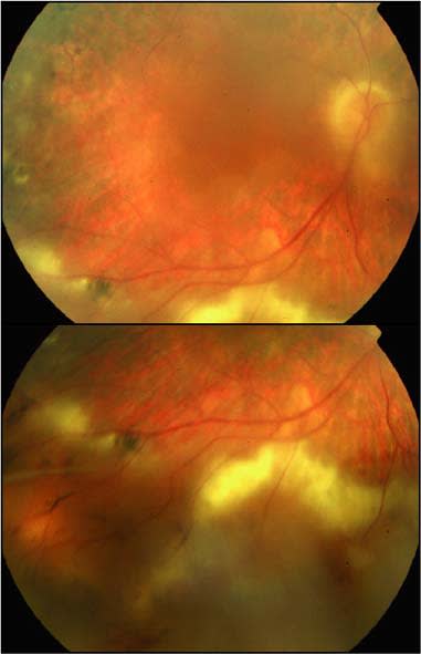 There is a Coats-type variant of RP thought to occur in as many as 3% of all RP patients. These fundi have typical bone spicules of RP with Coats-type changes in the inferotemporal quadrants (Figure 12). Retinal telangiectasia and exudative retinal detachments are treated with photocoagulation or cryosurgery as indicated.58