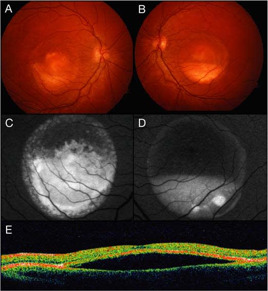 Figure 9. Best vitelliform dystrophy in a man 18 years of age. Color fundus photo (A) left eye and (B) right eye with resolving egg-yolk lesion. Autofluorescence (C) left eye and (D) right eye with corresponding hyperfluorescence. (E) Optical coherence tomography shows splitting of the RPE layer with elevation. Visual acuity is 20/200 OD and 20/20 OS.