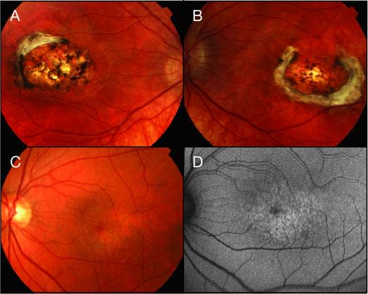 Choroideremia is an X-linked recessive rod-cone dystrophy that has marked atrophy of the choroid and RPE but does not feature intraretinal pigment migration.29 It is important to distinguish carriers of this trait from carriers of X-linked RP (XLRP) because they have similar fundi, but the prognosis for affected children is different (Figure 4). Boys with XLRP are more severely impaired than those with choroideremia. The distinction can be made with ERG of their mothers at child-bearing age: carriers of choroideremia are normal, while carriers of XLRP are often abnormal and sometimes asymmetrical.30