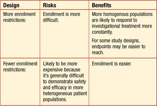 The risk: benefit ratio codified in the Declaration of Helsinki guides patient care. The declaration states, every biomedical research project ... [should] careful[ly] assess ... predictable risks in comparison with foreseeable benefits to the subject.6 The same rigorous, careful type of analysis can be used to guide clinical trial design. Each inclusion and exclusion criterion stated in a trial protocol can be considered in terms of risks, and benefits. Restrictive enrollment requirements may benefit the trial by making endpoints easier to reach, but may risk enrollment. As with patient care, the clinical trial risk: benefit ratio should always favor the benefit, side of the equation (Table).