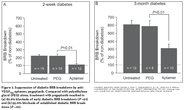Detailed studies of the involvement of VEGF indicate that one isoform, VEGF165 (or the rodent counterpart 164), may play an especially important role in both diabetes-induced retinal damage, as well as in the hypoxia-related neovascularization that can be a manifestation of DR. Compared to VEGF120, intravitreal injection of VEGF164 in nondiabetic rats led to approximately twice the level of ICAM-1 upregulation, retinal leukostasis, and BRB breakdown. In addition, intravitreal injection of pegaptanib sodium (Macugen, [OSI] Eyetech/Pfizer), a polyethylene-glycolated RNA aptamer that binds to VEGF164 but not to VEGF120, was able to reverse these effects in diabetic animals, leading to significant restoration of the BRB (Figure 2).92