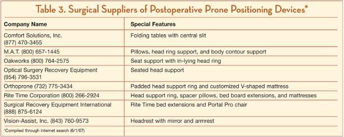 Headrest devices are variations of U-shaped, semifirm pillows that allow broad support over the forehead and sides of the face. This also relieves the stress on the neck extensor muscles. Most of our patients were happy they acquired them. Devices for body positioning include custom-made mats, massage tables, and even special ergonomically optimized positioning devices. Depending on the circumstances, patients may be interested in 1 of 2 classes of commercial devices: those designed for headrest and those for maintaining a prone body position. Many suppliers (Table 3) will sell the devices directly to you or your patients; some vendors offer rental plans. Most companies provide prompt delivery and setup/demonstration and will facilitate insurance reimbursement.