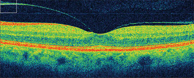 Figure 3. Spectral-domain OCT of fellow eye in patient shown in Figure 1. Vitreofoveal attachments are present but the patient is asymptomatic in the left eye.