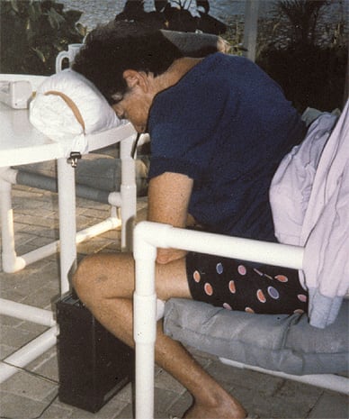 Although commercial devices are quite helpful, a creative patient can achieve satisfactory comfort using household items. For example, many patients spend waking hours resting their heads on pillows supported by a snack table (Figure 5). Leaning over the edge or side of the bed with pillows supported on a chair, using a small table, or even using a gap between mattresses to support the head while lying down may also be effective.