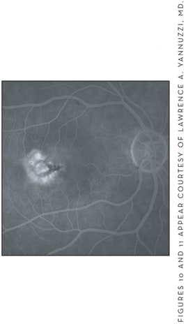 The prognosis for the retention of central vision may be good after the hemorrhages resolve, unless a focal area of chorioretinal atrophy or CNV develops.39,42 In the case of chorioretinal atrophy, the degeneration usually starts from the periphery of the lesion.39 CNV associated with lacquer crack is in general small and found in the macular region.39,43-45 If the CNV is accompanied by hemorrhage, when blood resorbs, a mild RPE proliferation may be seen; this pattern may obscure the CNV itself.