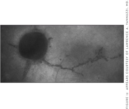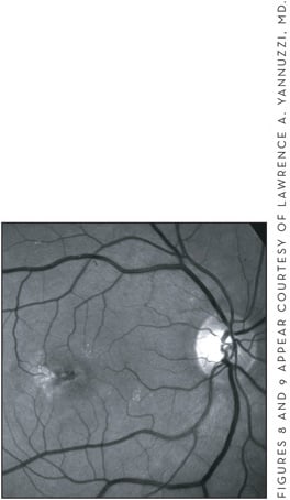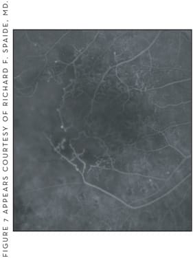 Most patients with IPT have bilateral disease on presentation, although many will only complain of visual changes in 1 eye. Common symptoms include blurred vision, metamorphopsia, positive scotoma due to exudation from ectatis, and incompetent retinal capillaries.34 VA is usually normal in the nonproliferative stage of the disease and only becomes affected when vessel dilation and blunting begins to be seen on biomicroscopy. In the proliferative stage, subfoveal atrophy and subretinal neovascularization late in the disease cause significant loss of central VA.34 Early in the disease the clinical exam is significant for loss of retinal transparency — usually in the temporal juxtafoveal area, but surrounding the fovea if advanced — and small telangiectatic vessels. The loss of transparency is usually gray and obscures the telangiectatic vessels on clinical exam. As the disease advances, there is prominent dilation of the capillaries and vessel dilation that can be either arteriolar or venous in nature. Other clinical findings include crystalline deposits, which can be seen at various stages of the disease, and subretinal plaques of pigmentation and dilated right-angle retinal vessels (Figures 8 and 9).33