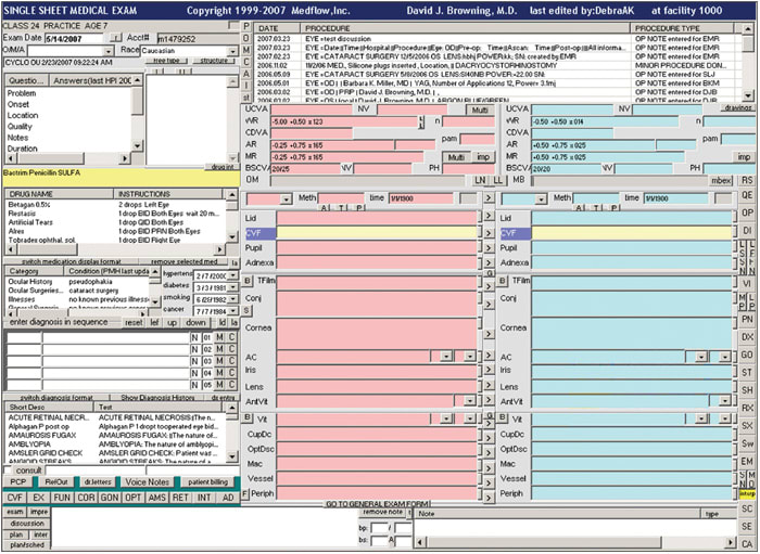 The EMR system we presently use is the fourth product we tried. The first was a generic product called Xscribe. The second was a generic EMR product from Medinformatix (Los Angeles, Calif). The third was an ophthalmology-specific program called Medformix (Crowell Systems, Charlotte, NC) used by a smaller group of 4 ophthalmologists who merged with our group and converted from their EMR product to the one in use by our larger absorbing group. The product currently in use by our ophthalmology department (and for the last 3 years) is Ophthalmicsuite (Medflow, Charlotte, NC). Medflow specifically designs EMR systems for ophthalmology practices.