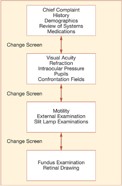 In our early experiences with EMR, we had multiple screens through which scrolling was required (sequential screens model, Figure 1). This design feature was not popular with most of our users. A better screen paradigm was developed by Medflow in which a single master screen acts as a hub with radiating spokes linking to other program areas by a single keystroke (Figure 2). A screen shot of the hub is shown in Figure 3. This model is preferred by the majority our ophthalmologists, although some expert users of the sequential screens model did not find it to be a problem.
