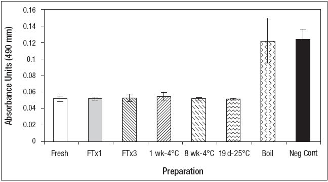 Ranibizumab has recently been granted FDA approval for intravitreal administration for the treatment of neovascular AMD. However, the cost of this medication, $1950 per intravitreal injection, is a concern for many patients and providers. Intravitreal bevacizumab has been shown by others to be an effective treatment for neovascular AMD in at least the short term.16-18With the rising costs of modern health care, it is vital to ensure widespread access to novel therapies that are effective and economical. Depending on the dose and efficiency of preparation, bevacizumab costs from $17 to $50 per intravitreal injection.21 Strict adherence to manufacturer guidelines would limit the use of bevacizumab to an 8-hour period once a vial of bevacizumab is punctured. This study provides objective data supporting a longer expiration time, with aseptic preparation and correct storage. These data are in concordance with a very recent report, which demonstrated up to 15.9% degradation of anti-VEGF activity of bevacizumab after withdrawal from a vial and storage at 4°C for 6 months.22 Our results indicate that there is no difference in binding between fresh and up to 8-weeks postpreparation of bevacizumab to VEGF protein as measured by sandwich ELISA. Similarly, no difference in binding was observed between fresh bevacizumab and bevacizumab that had been frozen and thawed up to 3 times.