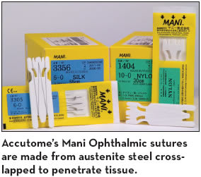 • Accutome has introduced a new Mani Ophthalmic Suture Line, with sutures made from austenite steel cross-lapped to penetrate tissue. It is also the only suture with a laserdrilled smooth end to eliminate damage to tissue or tissue drag. The laser-drilled hole also strengthens the bond between the needle and suture, says Accutome.