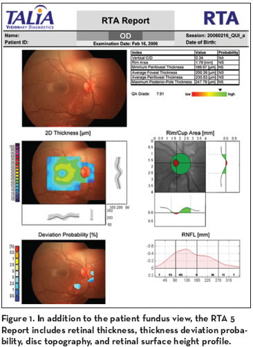 pathology involving the macula, perimacular, optic nerve head, and peripapillary regions of the retina. Among its features are: its ability to provide 72° x 60° digital fundus imaging with up to 9.4 megapixel resolution; SLO slit image viewing; retinal nerve fiber layer analysis; and peripapillary and optic nerve head analysis with rim/cup measurement, as well as retinal thickness analysis at over 1400 locations and dynamic 3-D anatomy imaging through all real slit sections. Automated progression analysis with deviation probability reporting and additional user-defined custom field testing — which increases the number of thickness measurements to more than 4200 defined retinal locations — are also part of the package (Figure 1).