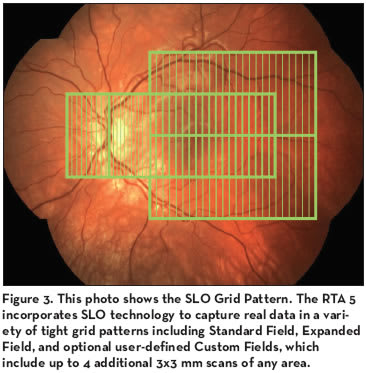 Also associated with the RTA 5 is the increased speed of individual scan times. “Each scan ranges from one third of a second to less than half of a second, and the system can do up to 10 scans. The older system did up to 13 smaller scans. Each scan area is now 10° by 20° — twice as large as with the previous model. Broader and faster is a good combination. With the larger scans there are fewer spaces between slit images, so the pathology has to be smaller than 0.7° for it to slip through the RTA 5 grid, which we call the ‘pathology net.’ It’s a vertical grid pattern created by each of the slits or cross-sections through the retina, and it’s the tightest parallel sectioning in the industry,” says Crocetta (Figure 3).