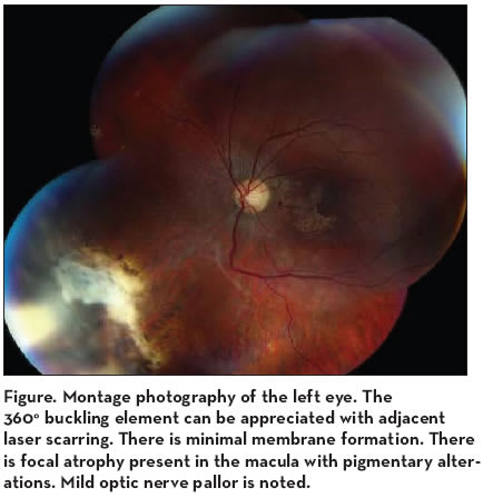 Traditionally, scleral buckle placement (SBP) is the first-line treatment for the repair of primary rhegmatogenous retinal detachment (RRD), particularly with inferior retinal pathology. In the repair of giant retinal tears, however, the use of pars plana vitrectomy (PPV) alone or in combination with SBP has been a mainstay.With improved instrumentation and fluidics, wide-angle viewing systems, lighting technology, heavy perfluorocarbon liquids, and transconjunctival surgery, the use of PPV has increased exponentially. This includes the use of PPV for the repair of RRD without the concomitant placement of a buckling element. The surgeon’s ultimate choice of surgical technique will depend on a variety of factors, including lens status, break location, presence of PVR, available surgical equipment, and surgeon comfort with either procedure. The use of SBP in combination with PPV may provide the best opportunity for single-operation success. The use of a buckling element provides support for “missed” retinal breaks or additional breaks present at the time of PPV while allowing improved ability to dissect anterior vitreous to release traction overlying retinal pathology. The patient presented above underwent SBP+PPV for repair of his complex pathology.While several retrospective, nonrandomized case series have been published comparing single-operation success rates of SBP with PPV for repair of RRD, the data are confounded by the fact that most of these reports include combined procedures (SBP+PPV) in the PPV data set.1