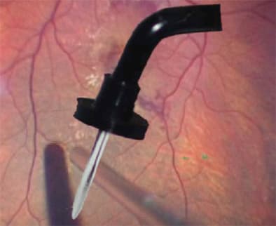 Surgeons and patients benefit from the use of smaller-gauge systems, such as 23-g (shown here).