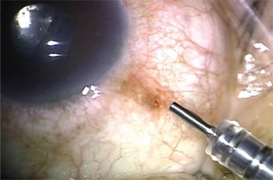 Dr. Charles: It is important to remember that the elasticity of the sclera is moderate compared to other elastic structures not significant enough to close the wound. I close the wound leaving the IOP pressure on 20 mm Hg and placing pressure over the scleral tunnel that I have created as I pull out the cannula tangential to the sclera.