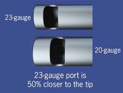 Because the port on the 23-g cutter is closer to the tip, you can cut tissue better, and fluidics offer more stability/control.