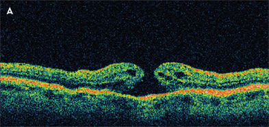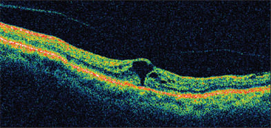 The classification system proposed prior to the optical coherence tomography (OCT) era is still used today, and the assumed mechanism has largely been supported by findings on OCT. In summary, stage 1 holes are not true holes but rather focal areas of vitreoretinal traction. Astage 1 hole has an equal chance to recover spontaneously as it does to progress to a stage 2 hole (full-thickness hole with vitreoretinal traction on the edge of the hole)(Figure 1). Once a stage 2 hole develops, there is little chance of spontaneous recovery, and surgical intervention is considered. Stage 3 and 4 holes are full-thickness holes, with the latter associated with a posterior vitreous detachment (Figure 2). Because studies suggest that the chance of visual improvement and anatomic success is higher if the surgical repair is performed within 6 months, it should not be delayed beyond this time frame.2