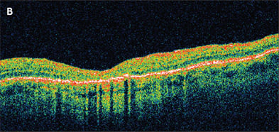 Figure 2. A. Stage 3 macular hole previtrectomy. B. Same eye 6 weeks after vitrectomy and successful closure of the macular hole.