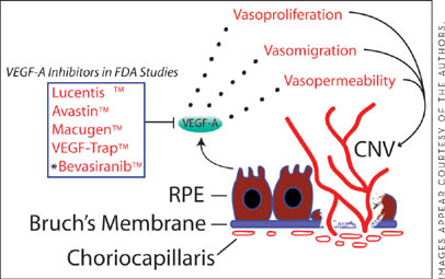 Currently, a leading hypothesis suggests that the accumulation of inflammatory debris below the retinal pigment epithelium (RPE) and within the choroid leads to the production of proangiogenic cytokines and eventual invasion by pathologic vasculature.1 As many scientists and clinicians suspected, drusen, which usually precede the neovascular disease process, harbor numerous components capable of inducing oxidative injury, inflammation, and vasoproliferation, potentially triggering CNV formation. Out of a panel of recently discovered and promising therapeutic targets, the most efficacious CNV treatments have relied on the inhibition of vascular endothelial growth factor (VEGF), a dominant mediator of neovascularization.