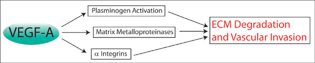 Figure 2. VEGF-A interacts with a host of proteins that are capable of degrading the ECM and thus compromising the integrity of Bruch's membrane. Thinning and eventual fracture of the membrane allow the abnormally growing choroid blood vessels to invade the retinal layers.