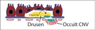 Figure 3. Complement factors are abundant in drusen and lead to the activation of numerous inflammatory pathways. C3a/C5a upregulates RPE production of VEGF-A which is able to stimulate choroidal endothelial cells to proliferate, migrate, and form leaky vasculature beneath Bruch's membrane, as in occult CNV, or break through to sub-RPE space and neural retina layers, as in classical CNV.