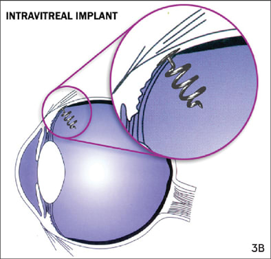 The prospective, randomized, double-masked STRIDE (Sustained Triamcinolone Release for Inhibition of Diabetic Macular Edema) trial assesses the safety and tolerability of the I-vation TA implant (Figures 3A, 3B, and 3C) in 30 patients. Dugel and colleagues reported results of a 6-month interim analysis. In the study, patients were randomized to either a slow-release or fast-release implant containing 925 μg of TA. At 6 months, the proportion of patients with BCVA of at least 70 ETDRS letters increased from 14% to 46% in the slow-release group and from 18% to 41% in the fast-release group. Eight percent of patients in the slow-release group and 18% in the fast-release group gained more than 15 letters. Macular thickness improvement was reported with the use of both implants. Mean IOP increased from 13.9 mm Hg to 16.1 mm Hg in the slow group and from 14.3 mm Hg to 16.4 mm Hg in the fast group at 6 months. The patients in the STRIDE study will be followed for 3 years.31