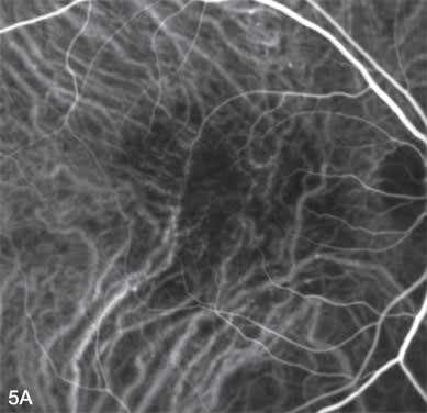 Polypoidal choroidal vasculopathy presents with multiple recurrent serosanguinous detachments of the RPE and neurosensory retina secondary to leakage and bleeding from choroidal vascular lesions (Figure 3A). Yanuzzi and associates describe the characteristic ICG angiographic findings of polypoidal lesions in the choroidal circulation and branching vascular networks (Figure 3B). ICGA can also show increased vascular permeability of the choroidal vasculature that can be indicative of a poorer prognosis.
