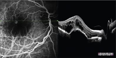 Figure 1. Simulataneous ICG/FA left and Spectralis (Heidelberg Engineering, Inc.) OCT right show intraretinal location characteristics of RAP.