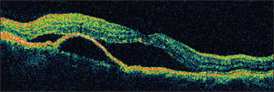 Figure 2B. OCT reveals pigment epithelium detachment as well a serous retinal detachment involving the fovea.