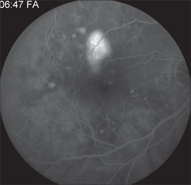 Figure 2A. Late-phase angiogram showing filling of pigment epithelium detachment in chronic CSR.
