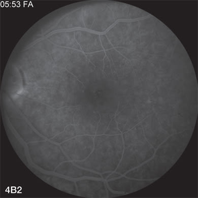 Figure 4 B. FA early and late shows only subtle changes corresponding to the retinal legions.