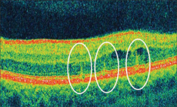 Figure 2. Imaging with the 3D OCT 1000 (Topcon), obtained 1 hour post PASCAL treatment, shows that the laser coagulative effects are limited to the outer retina. Burns have been circled for easier identification.