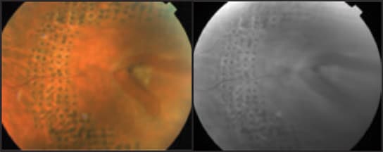 Figure 1. Color and red free photographs demonstrate the improvement in a peripheral retinal break 1 month after treatment with PASCAL laser irradiation.