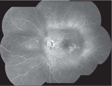 Figure 5. Composite fluorescein angiography in the early phases showing a delayed optic disc and arterial filling with extensive retinal ischemia involving both posterior pole and periphery.