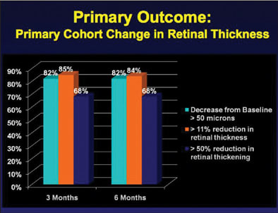 At six months, 37% of patients improved >10 letters of visual acuity. However, 23% of patients had a decrease in >10 letters of visual acuity. In terms of retinal thickening on OCT, there was a mean decrease of 153 µm in central retinal thickness (Figure 3), and 42% of patients had resolution of central DME.
